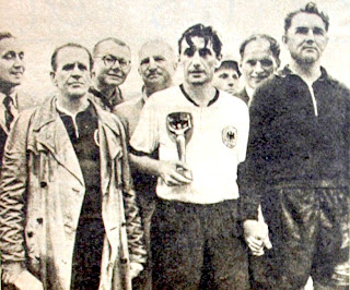 Unutulmayan Şampiyonluk : Alman milli takımının 1954 senesinde İsviçre'de yapılan futbol dünya şampiyonasındaki zaferini futbolcular ve çalıştırıcılar büyük fedakarlıklara katlanarak ince hesaplar yaparak kazanmışlardı. Resimde bunun tipik bir örneği görülüyor. Alman milli takımı şampiyon olduktan sonra yapılan seremonide emektar antrenör Herberger elinden eksik etmediği kitabı ile futbolcu kadar yorgun fakat çökmemiş bir yüzle milli marşlarını dinlerken takım kaptanı Fritz Walter bir eliyle şampiyonluk heykelini diğer eliyle de takım kalecisinin elini tutarak büyük başarılarının heyecanını yaşıyor. |