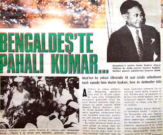 BANGLADEŞ'TE PAHALI KUMAR... Bangladeş'in sevilen devlet başkanı Ziya Ür Rahman bir darbe sonucu hayatını kaybetti. Darbeci general yakalanınca kurşuna dizildi. Ziya Ür Rahman'ın hazin cenaze törenine bir milyona yakın Bangladeş'li katıldı... Ülkede 6 ay içinde yeni seçimlere gidilmesi bekleniyor... |