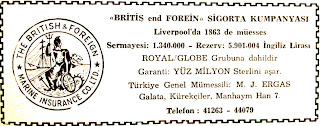 The British & Foreign Marine Insurance Co. Ltd. "Britiş ve Forein" Sigorta Kumpanyası Liverpool'da 1863'de müesses Sermayesi : 1.340.000 - Rezerv : 5.901.004 İngiliz Lirası Royal/Globe grubuna dahildir. Garanti : Yüz milyon Sterlini aşar. Türkiye Genel Mümessili : M. J. Ergas İstanbul, Galata Kürekçiler Manhaym han 7 Telefon : 41263 - 44079 (1953) |