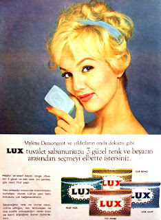 Mylene Demongeot ve yıldızların onda dokuzu gibi LUX tuvalet sabununuzu 3 güzel renk ve beyazın arasından seçmeyi elbet istersiniz. Meşhur ananevi beyaz renge ilaveten 3 güzel tatlı renk : toz pembe, gök mavi, filizi yeşil. Yeni ambalajı sayesinde mükemmelen muhafaza olunan LUX'ün yeni hafif kokusunu çok beğeneceksiniz. Seçeceğiniz renk ne olursa olsun, LUX'ün saflığını, teni temizleyen ve ona kadife yumuşaklığını veren koyu ve tesirli köpüğünü daima bulacaksınız... 1962 |