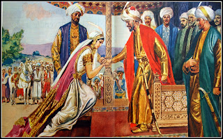 Bulgar kralı Sisman Türklerin himayesine sığınmak için kız kardeşi Tamara'yı (Kera Tamara) beraberine alıp Osmanlı beyinin yanına gitti. Murat Hüdavendigar Türk misafirperverliğine uygun bir şekilde onları çadırının kapısında karşıladı (Münif Fehim Özarman tablosu) |