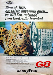 Goodyear Şimşek hızı, emsalsiz dayanma gücü... Ve 100 km üstünde tam kontrollü hareket. İşte Goodyear g8 binek lastiğinin size sağladığı avantajlar : Direksiyon hakimiyeti : Yalnız Goodyear'dan alacağınız yuvarlak omuz ve modern desenli g8 binek lastiği yola emniyetle basar, ani frende kati netice, virajda ve kaygan satıhlarda emniyetli tutunma sağlar. Emsalsiz dayanma gücü : Çift kauçuk tabanlı g8 ısınma ve darbelere mukavimdir. Normal lastiklere kıyasla çok daha fazla kilometre yapar. En uzun ömürlü lastiktir. Kontrollü hareket : Şimşek hızı, bir kedi çevikliği ile hareketlerinize uyma kabiliyeti, her çeşit yolda milyonlarca kilometre tecrübe ile ispatlanmıştır. Bilhassa kaygan yollarda... G8 Tek modern lastik Goodyear Emniyetinizi düşünen isim (1969) |