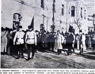O günlerin Ankara'sı : Sivas kongresinin kapanışından sonra Mustafa Kemal paşa yanındakilerle Ankara'ya gelişinde büyük sevgi tezahüratı ile karşılanmıştı. Fotoğrafta o gün halkın coşkunluk gösterileri arasında kurtarıcının yürüyüşü görülmektedir. |