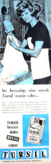 Bu beyazlığı size ancak Tursil temin eder... Evet; Tursil ile yıkayacağınız çamaşırların ne kadar beyaz, ne kadar da temiz olduğunu derhal göreceksiniz. Çamaşırlarınızı ve ellerinizi hiç bozmadan ve yıpratmadan iş gören Tursil sizi de muhakkak hayran bırakacak. Bugün bir kutu Tursil almayı ihmal etmeyin. Tursil beyazı daha beyaz yapar. TURSİL çamaşır tozu Turyağ fabrikaları mamulüdür... (1962) |