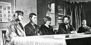 ARTIK DUDAKLARINDA "TATLI TEBESSÜM" VAR... "Acı Tebessüm" romanının yazarı Françoise Sagan yakışıklı bir Amerikan genciyle sessizce evlendi. Üstte nikah töreni : Soldan sağa : Françoise Sagan'ın kız kardeşi Suzanne Deforey (damadın şahidi), damat R. J. Weithoff, gelin Françoise Sagan, Jacques Quoirez (gelinin şahidi) görülmektedir. |