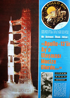 BİR ASTRONOT İTHAM EDİYOR : "APOLLO-13'ÜN AY'A ULAŞMASI MUCİZE OLURDU..." GÜNEŞ TANRISI APOLLO : Üstte görülen arma Güneş tanrısı Apollo'yu temsil etmekte. Üç at güneş arabasını dünyadan ay'a doğru çekmektedir. Sol fotoğrafta ise Apollo-13'ü uzaya götüren Saturn-5 roketi görülmekte. İTHAM EDEN ASTRONOT : Halen Amerika'da Cornell üniversitesinde astronomi profesörlüğü yapan eski uzay adamı Brian O'Leary üç yıl önce astronot adayı seçilmiş fakat bir süre sonra istifa edip çekilmişti. Daha sonra NASA uzay merkezinde gördüklerini açıklayan Brian, uzay merkezinde ilim adamlarından çok deneme pilotlarına önem verilmesini doğru bulmamaktadır. Üstteki fotoğrafta eski astronot 1 yaşındaki oğlu ile görülmekte...1970