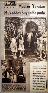 HAYAT EKİBİ MUCİZE YARATAN SUYUN BAŞINDA Muhabirimiz Turgut Etingü, Aladağ'dan yazıyor - Fotoğraflar : İnal Tengizman 22. Sayımızda çıkan "Mucize yaratan su" röportajımız okuyucularımızın büyük ilgisini gördü. Sayısız mektup ve telefon aldık. Okurlarımız bizden daha etraflı bilgi ve resim istiyorlardı. Durumu dikkate alan mecmuamız Aladağ'da bulunan Mukaddes Su'ya Hayat ekibini gönderdi. İŞTE MUCİZE YARATAN SU : Bugün Aladağ'ın tepesindeki Meryem Ana Tapınağının hemen altından akan Mukaddes Su yaşama ümidini kaybetmiş birçok hastaların ancak "mucize" kelimesiyle anlatılması mümkün olan bir şifa özelliği göstermektedir. Bazı felçliler, romatizmalılar, ülser hastaları, böbrek hastaları, veremliler buradan iyi olup gitmektedirler. Fotoğrafta görüldüğü gibi yılın her gününde buraya ziyaretçiler gelir. |