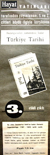 Hayat yayınları tarafından yayınlanan 1. ve 2. ciltleri büyük ilgiyle karşılanan Başlangıcından zamanımıza kadar Türkiye tarihi 3. cildi çıktı ! Bu ciltte : İstanbul'un fethine kadar Osmanlı imparatorluğu (1281-1453) tarihi vardır. T. Yılmaz Öztuna tarafından, ilk defa ilmi bir görüşle hazırlanan ve takriben 12 ciltte tamamlanacak olan Türkiye tarihinin her cildi 300 sayfalık metin, birçok harita, şema, hanedan listeleri ve tifdruk baskısı resimlerle süslü olarak renkli kapak içindedir. Fiyatı 7,5 lira Tevzi yeri : Bateş bayilik teşkilatı - Cağaloğlu - İstanbul (1964) |