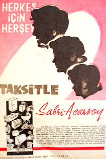 Herkes için her şey taksitle Sabri Acarsoy Buzdolabı, bakkal vitrinleri, şerbetlik, dondurma kapları, çamaşır, bulaşık, cila, hesap, fotoğraf, sinema, berber saç kurutma, pastırma, çorap çekme, aile ve sanayi dikiş makineleri. Otomobil, kamyon, bisiklet motosiklet lastikleri. Hava gazı fırınları, ocakları ve şofbenleri. Yazar vezne kasaları, para kasaları. Masa ve duvar saatleri. Muhtelif marka radyo, teyp, pikap, gitar, piyano, akordeon, keman. Bisiklet, motosikletler. Telefon ve santralleri. Otomatik bakkal ve insan tartan baskül ve çocuk terazileri. Tavan ve masa vantilatörleri. Odun, kömür, gaz, elektrik sobaları. Elektrik süpürgeleri, düdüklü tencereler, fitilli ve pompalı gaz ocakları. Çocuk araba ve pusetleri. Dıştan ve içten takma deniz motorları ve her aradığınız ev eşyası. Tophane Boğazkesen caddesi 168 Tel: 49 18 76 (1953) |