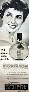 Zeki kadınlar daha güzeldir... Zira temiz, lekesiz bir cildin Scherk yüz losyonunun yarattığı mucize ile elde edildiğini bilirler. Çabuk ve ani tesirine hayret edersiniz. Scherk hemen cildin derinliklerine nüfuz eder ve toz, kir, krem vesaire artığı gibi ne varsa yok eder, cildi serinletir, teni fevkalade temizler, pürüzleri yok eder. Siz de cildinize bir şans veriniz ve bugünden tezi yok bir Scherk tecrübesi yapınız...1963 |
