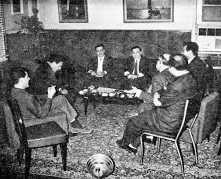Toplantı "Ses 1962 kapak yıldızı" müsabakasını kazanacaklara film çevirtmeyi taahhüt eden Be-Ya film sahibi Nusret İkbal (soldan ikinci) ve Birsel film sahipleri Özdemir Birsel ve Nüshet Birsel (karşıda oturanlar) idarehane neşriyat müdürü ve ses'i çıkaran diğer arkadaşlarla...1962 |