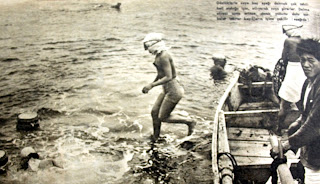 Gözlüklerle suya baş aşağı dalmak çok tehlikeli olduğu için bu şekilde atlayarak suya girerler. Dalma işi sonunda alt fotoğrafta görüldüğü gibi toplanan agar agar'lar kayığın içine çekilir. |