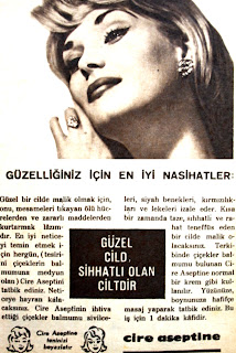 Güzelliğiniz için en iyi nasihatler : Güzel bir cilde malik olmak için onu, mesameleri tıkayan ölü hücrelerden ve zararlı maddelerden kurtarmak lazımdır. En iyi neticeyi temin etmek için her gün (tesirini çiçeklerin bal mumuna medyun olan) Cire aseptini tatbik ediniz. Neticeye hayran kalacaksınız. Cire aseptinin ihtiva ettiği çiçekler bal mumu sivilceleri, siyah benekleri, kırmızılıklar ve lekeleri izale eder. Kısa bir zamanda taze, sıhhatli ve rahat teneffüs eden bir cilde malik olacaksınız. Terkibinde çiçekler bal mumu bulunan Cire aseptine normal bir krem gibi kullanılır. Yüzünüze, boynunuza hafifçe masaj yaparak tatbik ediniz. Bu iş için 1 dakika kafidir. Cire aseptine teninizi beyazlatır...1962 |
