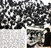 Evvelki hafta İzmir'e gidip gelen yıldız orada kaldığı müddet zarfında devamlı olarak hayranlarının tezahüratı ile karşılaştı. Göksel Arsoy kaldığı otelde zaman zaman genç okulluların hücumuna da uğradı. Yukarıdaki ve yandaki fotoğraflar bu sahnelerden birini tespit etmektedir. Talebeler sevimli yıldızı otelin önünde kuşattıktan sonra hayli imza almaya muvaffak olmuşlar. Fakat az sonra otele sığınan Arsoy bu defa pencereden girenlerle karşılaşmıştır. Bir saatten daha fazla süren imza ve fotoğraf dağıtımı sona erdiği zaman Göksel Arsoy bir hayli yorulmuştu...1962 |