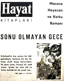 Macera, heyecan ve korku romanı Sonu Olmayan Gece Grönland'ın kuş uçmaz bir bölgesindeyiz, korkunç bir kar fırtınası etrafı kasıp kavururken bir gece yarısı buraya bir uçak iniyor. İçinde bir sürü ölü ve koma halinde bir de yaralı var... 160 sayfa - 3 lira (1964 Hayat Kitapları) |