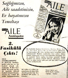 Sağlığınızın, Aile saadetinizin, ev hayatınızın temel taşı Hayat AİLE Ansiklopedisi 2. Fasikülü çıktı ! AİLE ANSİKLOPEDİSİ'de HAYAT Ansiklopedisi gibi her ay bir fasikül olarak çıkmaktadır. Her fasikülde 80 sayfa metin, 16 sayfalık tifdruk baskılı fotoğraf kısmı, ayrıca be renkli iki tablo bulunmaktadır. 2 ciltte (1 yılda) tamamlanacak olan Aile ansiklopedisinin her fasikülü 100 sayfa - 5 liradır (1964) |