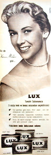 Sizde Vera Miles gibi LUX tuvalet sabununuzu 3 cazip renk ve beyaz arasından seçebilirsiniz. * Toz pembe, gök mavi, filizi yeşil... Sizi büyüleyecek tatlı renklerdir ! * Yeni ambalajı sayesinde muhafaza olunan harika kokusuna hayran kalacaksınız ! * Koyu ve tesirli köpüğü teninizi temizler, kadife gibi yumuşak yapar. Yıldızların onda dokuzunun sabunu. (1962) |