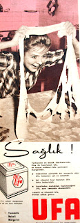 Sağlık ! Türkiye'nin en büyük fabrikalarında, itina ile hazırlanan Ufa, en hassas mideleri bile yormayan margarindir. * Mükemmel yemeklik bir margarin olan Ufa, tamamen saf ve nebatidir. * Bol vitamini havi bulunan Ufa, daha besleyicidir. * Lezzetinden muhakkak hoşlanacağınız Ufa, aynı zamanda ekonomiktir. Lezzetli ve vitaminli Ufa, evinize sıhhat getirir. Ufa nebati margarini siz de bir kere deneyiniz...1962 |