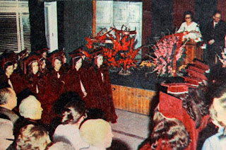 En mutlu gün : Üsküdar Amerikan kız kolejini bu yıl bitiren öğrenciler okul müdürü Makbule Kurtmusaoğlu tarafından yapılan bir veda konuşmasından sonra diplomalarını aldılar. Resimde öğrenciler başlarında kepleri, mezuniyet töreninde müdürlerini dinliyor. |