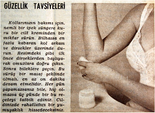 Güzellik Tavsiyeleri : Kol Bakımı. Kollarınızın bakımı için nemli bir ipek süngere kuru bir cilt kreminden bir miktar sürün. Bilhassa en fazla kabaran kol arkası ve dirsekler üzerinde durun. Resimdeki gibi ilk önce dirseklerden başlayarak omuzlara doğru çıkın. Sonra bileklere geçin. Bu sürüş bir masaj şeklinde olmalı, en az 10 dakika devam etmelidir. Her gün yapamazsanız bile hiç olmazsa üç günde bir bu reçeteyi tatbik ediniz. Cildinizde rahatlatıcı bir yumuşaklık hissedeceksiniz...1960 |