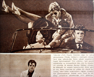 Yukarıda "Tatlı hayat" filminden diğer bir sahne görüyorsunuz. Filmde Vatikan'ın "Cemiyetin mikropları" diye adlandırdığı Roma yüksek sosyetesinin hayatı belirtilmektedir. Film yıldızları işsiz güçsüz aristokratlar ve miras yediler ile dolu olan bu sosyetenin çıkardığı ilk skandal Montezi hadisesi olmuştu. Bu hadisede bir sosyete toplantısından dönen genç bir kız Roma civarında bir plajda ölü olarak bulunmuş fakat bütün araştırmalara rağmen cinayetin faali yakalanamamıştı. Soldaki resim filmin bu hadiseyi canlandıran sahnelerinden birini gösteriyor...1960 |