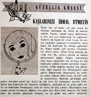 GÜZELLİK KÖŞESİ KAŞLARINIZI İHMAL ETMEYİN Onlar her ne kadar cilt gibi büyük bir ihtimam istemezse de, ihmal de edilmemelidir. Kaşları, kepek yapıp dökülmemesi için, ara sıra badem yağı ile yağ sürmeli, tüylerini de küçük bir rimel fırçası ile daima aşağıdan yukarıya doğru fırçaladıktan sonra kaşın üst kısmında bir hizaya getirmelidir. Kaşın tüyleri çok uzunsa, fırçaladıktan sonra onları üstten biraz kesmek yerinde olur. Bu, onların parlak ve dolgun görünmesini sağlar. Kaşlar, kahverengi veya kaşın renginden çok az koyu bir kaş kalemiyle sadece tüylere sürülerek boyanmalıdır. Cilde dağılan boyalar hoş görünmez. Eğer kaşınızı hiç almadıysanız veya şeklini değiştirmek istiyorsanız bu metodu tatbik ederek daha kolay ve kati netice alabilirsiniz. Resimde görüldüğü gibi onları almadan evvel her ikisini de çok kalın bir fondasyon sürerek örtün. Sonra kaş kalemiyle bir tanesine istediğiniz, yüzünüze en iyi giden şekli verin ve ötekinden fondasyonu ıslak bir havlu ile silip çıkarın. Boyadığınız kaşı model olarak bırakarak diğerini ona göre alın. Bunu öbür kaşınıza da tatbik edin. Bu suretle yüzünüze kolayca, en iyi giden kaş şeklini verirsiniz...1962 Hayat Dergisi. |