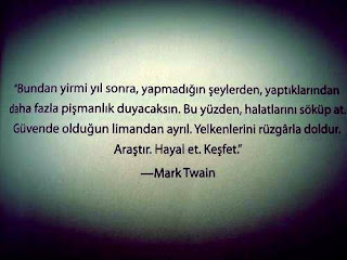 Bu yüzden halatlarını söküp at güvende olduğun limandan ayrıl, yelkenlerini rüzgarla doldur, araştır, hayal et, keşfet !