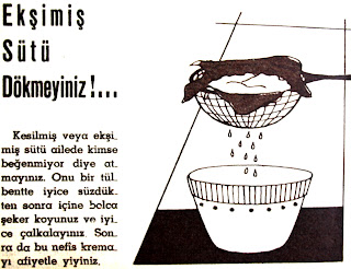 Kesilmiş veya ekşimiş sütü ailede kimse beğenmiyor diye atmayınız. Onu bir tülbentte süzdükten sonra içine bolca şeker koyunuz ve iyice çalkalayınız. Sonra da bu nefis kremayı afiyetle yiyiniz.