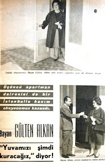 Talihli okuyucumuz Bayan Gülten Alkan yeni evinin eşiğinden içeri ilk adımını atıyor ve Bayan Alkan evinin anahtarını teslim alırken 3. Apartman dairesini de İstanbullu hanım okuyucumuz kazandı. Bayan GÜLTEN ALKAN "Yuvamızı şimdi kuracağız" diyor ! Yapı ve Kredi Bankasının otomatik makinelerinin çektiği numarayı İstanbul 2. Noteri Umran Nazif Yiğiter her zamanki gibi serinkanlı ses tonu ile okudu. Çekilen numaranın karşılığı süratle arandı. Kısa bir süre sonra Hayat mecmuasının 3. apartman dairesini kazanan talihli okuyucu belli olmuştu : Bayan Gülten Alkan ! 22 ekim 1962 perşembe günü Hayat ve Ses mecmualarının yetkililerinin de katıldığı bu çekilişle, büyük rağbet gören "Her ay bir apartman dairesi" müsabakamızın 3. talihlisi de meydana çıkmış oluyordu. Çamlıca kız lisesi mezunu olan Bayan Gülten Alkan, 34 yaşında bir ev hanımı. 13 yıldır evli, 12 yaşında Deniz adında bir kızı var. Eşi ise Marmara vapurunun 2. kaptanı Bay Ziya Alkan. Mesut haberi bizden öğrendikleri vakit Alkan ailesinin halen oturmakta oldukları Acıbadem'de bulunan yuvaları bir an içinde neşeye gark oldu. Bayan Gülten sevinçle kızını kucaklarken "Asıl yuvamızı şimdi kuracağız..." diyordu. Ana-kızın sevinci hakikaten görülecek şeydi. Bay Ziya Alkan gemisiyle seferde olduğu için henüz bu mutlu haberi öğrenememişti. Haberi alınca birde onun sevincini düşünerek içleri içlerine sığmıyordu. Hayat'ın devamlı okuyucusu olduğunu söyleyen Bayan Gülten, bundan sonraki çekiliş içinde diğer Hayat okuyucularına iyi şanslar dilediğini fakat kendisininde bu yarışa katılacağını ilave etti. Bizde Alkan'lara yeni evlerinde saadetler dilerken gelecek kur'aya katılacak okuyucularımıza şans açıklığı temenni ederiz... |