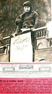 Her şey bu kürsüden başladı Yukarıda tarihi Sultanahmet mitinginde konuşmakta olan Halide Edib'i görüyorsunuz. Siyah çarşafı rüzgarda kapkara bir matem bayrağı gibi dalgalanıyor. Yüz hatları gergin, rengi solgundur. Bakışlarında Türk milletinin o günkü kini, nefreti ve yas tutan, kan ağlayan içi okunmaktadır. Kürsünün önündeki levhada meşhur "Wilson prensibi 12. madde" yazılmış. Alttaki fotoğraf 1919 yılının 24 mayıs sabahı İstanbul'da çıkmış "Tasvir i Efkar" gazetesinin Sultanahmet mitingine ayırdığı birinci sayfasının klişesidir. Solda ise nutkunun tam metni görülüyor. |
