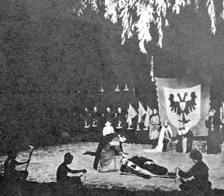 İstanbul şehir tiyatrosunun Rumeli hisarındaki açık hava temsilleri büyük bir ilgi görmüştür. Hamlet, Macbeth ve tarla kuşunun yer aldığı bu temsillerin ilki Hamlet'ti. Hamlet rolünü bir defa daha bir kadın sanatçımız canlandırıyordu. Ayla Algan bu rolde bir hayli alkış toplamaya muvaffak oldu. Üst fotoğrafta Hamlet'ten bir sahne alt fotoğrafta sol başta vali, ordu kumandanı ile seyirciler görülüyor...1962 |