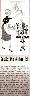 Kaktüs meraklıları için öneriler 1960. Yaz mevsimi başlarken kabilse kaktüsleri açık havada tutun ama bu arada yakıcı güneşe maruz kalmamalarına bilhassa dikkat edin. Bu müddet zarfında bolca sulayınız. Sonbaharın başlaması ile ise sulama işine son verin ki sıcak mevsim boyunca çıkan filizler gelişebilsin. Kışın kaktüsleri 3 ile 10 derece arasında muhafaza etmek doğru olur. Bu aylar içinde de fazla su istemezler. (Kışın çiçek açan kaktüsler bunda bir istisna teşkil eder.) Saksı değiştirme işi ancak ilkbaharda yapılmalı ve tomurcuklandığı zaman da yerlerini değiştirmemelidir. Aksi halde kuruyup bozulurlar. |