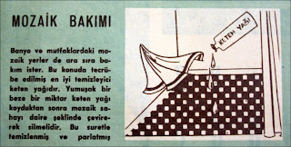 Mozaik bakımı & Keten yağı 1962 Banyo ve mutfaklardaki mozaik yerler de ara sıra bakım ister. Bu konuda tecrübe edilmiş en iyi temizleyici keten yağıdır. Yumuşak bir beze bir miktar keten yağı koyduktan sonra mozaik sahayı daire şeklinde çevirerek silmelidir. Bu suretle temizlenmiş ve parlatmış olacaksınız. |