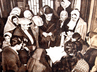 New york Türk kadınlar birliği ve New York Türk yardımlaşma cemiyetinden Türkiye'deki yoksullara yardım derneğine bağış yolu ile yüz bin liralık çeşitli yiyecek maddesi ve giyecek eşyası gönderilmiş yardıma muhtaçlara dağıtılmıştır...1960 1930'lu yıllara ait bu fotoğrafta; İstanbul Türk kadınlar birliği azaları bir çelenk koyma töreni öncesinde toplu halde görülmekte. |