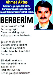 | BERBERİM Saçım sakalım uzadı Serseri gibiyim Gezerim, deli gibiyim Yol papazlarımı berberim Saçlarım bitlendi Üst katı kiraya verdim Kiramı da alamadım Kurtar beni bu kiracıdan Berberim Elindedir makasın Pek hünerlidir ellerin Tatlıdır dilin Herkesi seversin Benim yakışıklı berberim... Ahmet Aktaş Gölcük'te yaşıyor. Bir kamu kuruluşunda çalışıyor. Bu şiiri Gölcük'teki berberlere ithaf etmiş. |