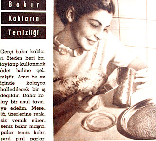 Bakır Kapların Temizliği Gerçi bakır kapları öteden beri kalay işlemi yaptırıp kullanmak adet haline gelmiştir. Ama bu ev içinde kolayca halledilecek bir iş değildir. Daha kolay bir usul tavsiye edelim : Mesela üstlerine renksiz vernik sürerseniz bakır maşrapalar temiz kalır, pırıl pırıl parlar...1960 Hayat Dergisi. |