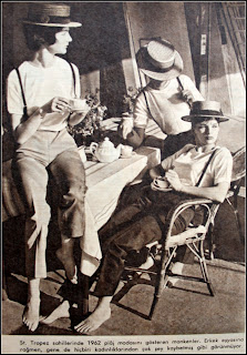 St. Tropez sahillerinde 1962 plaj modasını gösteren mankenler. Erkek eşyasına rağmen, gene de hiçbiri kadınlıklarından çok şey kaybetmiş gibi görünmüyor. |