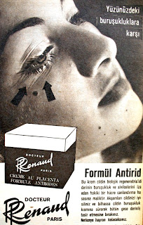Yüzünüzdeki buruşukluklara karşı Docteur Renaud Paris creme au placenta formule antirides (formül antirid) Bu krem cildin biyolojik regeneratris'idir. Derinin buruşukluk ve sivilcelerini izale eden hakiki bir hücre canlandırma hassasına maliktir. Akşamları cildinizi iyice siliniz ve bilhassa cildin buruşukluk taşıyan kısmına sürerek bütün gece derinliğine tesir etmesine bırakınız. Neticeye hayran kalacaksınız...1962 |
