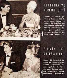 Tcherina ve Perkins çifti : Paris Operası Basın Balosu gecesi gecenin pek samimi görünen çiftlerinden biri de beyaz saten elbisesi ve turbanı ile bakışları çeken Ludmilla Tcherina ve Anthony Perkins'di. Bütün gece Ludmilla'nın yanından ayrılmayan Anthony pek keyifliydi. Filmin iki kahramanı : Filmin iki baş artisti le Royer ile Pascale Audret baloda zamanımıza uygun kıyafetler ile filmden sonra beraber oturarak davetlilere gerçek çehrelerini gösterdiler...1960 |