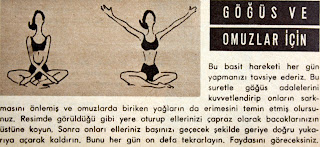 Göğüs Ve Omuzlar İçin Bu basit hareketi her gün yapmanızı tavsiye ederiz. Bu suretle göğüs adalelerini kuvvetlendirip onların sarkmasını önlemiş ve omuzlarda biriken yağların da erimesini temin etmiş olursunuz. Resimde görüldüğü gibi yere oturup ellerinizi çapraz olarak bacaklarınızın üstüne koyun. Sonra onları elleriniz başınıza gelecek şekilde geriye doğru yukarıya açarak kaldırın. Bunu her gün on defa tekrarlayın. Faydasını göreceksiniz...1962 |