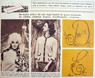 El İşi Meraklıları İçin Kadın okuyucularımız için özel olarak hazırladığımız bu sayfalardaki konular hakkında dilek ve sorularınızı "hayat kadınlar dünyası servisi"ne bildirmenizi rica ederiz. Bu hafta sizlere iki yün örgü modeli ile geçen sayımızda da takdim ettiğimiz kanava örneklerinden veriyoruz. * Beyaz moherden örülmüş reglan kollu rahat bir süveter. Bunu isterseniz Selanik, fantezi lastik veya 6 ters, 2 yüz ilmikle desenli olarak yapabilirsiniz. * Bordürleri etekliğin renginden çift lastikten yapılmış bu bej düz örgü buklet yün ceketin, kahverengi etekliği bir yüzlü örgüyle örülmüş ve astarlanmış. Mukavvadan üstüne istediğiniz desende kumaş kaplayarak muhtelif ebatta yapabileceğiniz güzel bir kutu. Bunu çamaşır ve mendil şasesi olarak kullanabileceğiniz gibi, mektup zarfı ile kağıtlarınızı muhafaza edebilmek içinde kullanabilirsiniz...1962 |