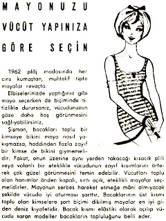 MAYONUZU VÜCUT YAPINIZA GÖRE SEÇİN 1962 Plaj modasında bu cins kumaştan, muhtelif tipte mayolar revaçta. Elbiselerinizde yaptığınız gibi mayo seçerken de biçiminde titizlikle durursanız, vücudunuzun göze daha hoş görünmesini sağlayabilirsiniz. Şişman, bacakları toplu bir kimseye bikini mayo nasıl yakışmazsa haddinden fazla zayıf bir kimse de bikini giymemelidir. Fakat onun üzerine aynı yerden takacağı kısacık plili veya volanlı bir eteklik ile vücudunun zayıf kısımlarını örterek çok güzel görünmesini temin edebilir. Vücutları toplu olan hanımlar önden kapalı, sırtı açık, eteklikli mayolar seçmelidirler. Mayonun serbest hareket etmeye mani olmayacak şekilde vücuda iyi oturması şarttır. Bacaklarının üst kısmı toplu olan kimselere şort biçimi dikilmiş mayolar en iyi giden deniz kıyafetidir. Bacak kısmı elastiki olarak açılıp vücudu saran modeller bacakların topluluğunu belli eder...1962 |