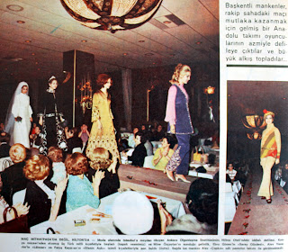 Başkentli mankenler rakip sahadaki maçı mutlaka kazanmak için gelmiş bir Anadolu takımının oyuncularının azmiyle defileye çıktılar ve büyük alkış topladılar. Maç Mithatpaşa'da değil Hilton'da : Moda aleminde İstanbul'a meydan okuyan Ankara olgunlaşma enstitüsünün Hilton otelindeki iddialı defilesi Konya müzesinden alınmış üç Türk milli kıyafetiyle başladı (kapak resmimiz) ve Mine Özçaylan'ın sunduğu gelinlik, Ebru Gönen'in "Saray gözdesi", Alev Yenerim'in "Lalezar" ve Fatoş Kayacan'ın "Efe'nin aşkı" isimli kıyafetleriyle son buldu (üstte). Sağda ise manken Alev "Çapkın" adlı pantolon takımı ile görülmektedir...1970 |