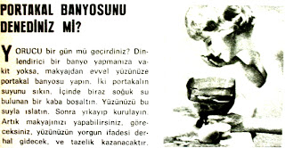 Portakal banyosunu denediniz mi ? Yorucu bir gün mü geçirdiniz ? Dinlendirici bir banyo yapmanıza vakit yoksa makyajdan evvel yüzünüze portakal banyosu yapın. İki portakalın suyunu sıkın. İçinde biraz soğuk su bulunan bir kaba boşaltın. Yüzünüzü bu suyla ıslatın. Sonra yıkayıp kurulayın. Artık makyajınızı yapabilirsiniz. Göreceksiniz yüzünüzün yorgun ifadesi derhal gidecek ve tazelik kazanacaktır...1970 |
