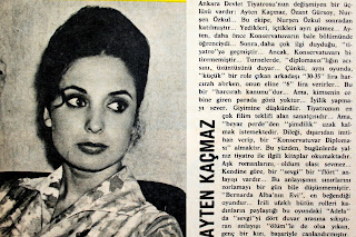 Ankara devlet tiyatrosunun değişmeyen bir üçlüsü vardır : Ayten Kaçmaz, Özant Gürsoy, Nurşen Özkul... Bu ekibe Nurşen Özkul sonradan katılmıştır. Yedikleri, içtikleri ayrı gitmez... Ayten daha önce konservatuvarın bale bölümünde öğrenciydi. Sonra, daha çok ilgi duyduğu "tiyatro"ya geçmiştir. Ancak konservatuvarı bitirememiştir. Turnelerde diplomasız olmanın acısını, üzüntüsünü duyar. Çünkü aynı oyunda küçük bir role çıkan arkadaşı 30-35 lira harcırah alırken, onun eline 6 lira verirler. Bu bir harcırah kanunudur. Ama kimsenin cebine giren parada gözü yoktur. İyilik yapmayı sever. Giyimine düşkündür. Tiyatronun en çok film teklifi alan sanatçıdır. Ama beyaz perdeden şimdilik uzak kalmak istemektedir. Dileği dışarıdan imtihan verip bir konservatuvar diploması almaktır. Bu yüzden bugünlerde yalnız tiyatro ile ilgili kitaplar okumaktadır. Aşk romanlarını oldum olası sevmez. Kendine göre bir "sevgi" ve "flört" anlayışı vardır. Bu anlayışının sınırlarını zorlamayı bir gün bile düşünmemiştir. "Bernarda Alba'nın evi" en beğendiği oyundur. İrili ufaklı bütün rolleri kadınların paylaştığı bu oyundaki "Adela"da "sevgi"yi dört duvar arasına sıkıştıran anlayışı "ölüm"le de olsa yıkan, genç bir kızı başarıyla canlandırmıştır...1962 |