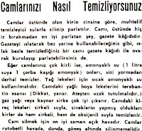 Camlarınızı Nasıl Temizliyorsunuz ? Camlar üstünde olan kirin cinsine göre muhtelif temizleyici sularla silinip parlatılır. Camı üstünde hiç iz bırakmadan en iyi parlatan şey gazete kağıdıdır. Gazeteyi ıslatarak bez yerine kullanabileceğiniz gibi ıslak bezle temizlediğiniz bir camı gazete kağıdı ile ovarak kurulayıp parlatabilirsiniz de. Eğer camlarınız çok kirli ise amonyaklı su (1 litre suya 1 çorba kaşığı amonyak) onları sizi yormadan derhal temizler. Yağ lekeleri için sıcak amonyaklı su kullanılmalıdır. Camdaki yağlı boya lekelerini terebantin esansı (Dikkat yanar. Ateşten uzak tutulmalıdır.) gaz yağı veya kaynar sirke çok iyi çıkarır. Camdaki kireç lekeleri sirkeli suyla, sineklerin yapmış oldukları kirler de hem sirkeli, hem de oksijenli suyla temizlenir. Cam silmek için en iyi zaman açık havadır. Camlar rutubetli havada, donda, güneş altında silinmemelidir. 1963 Hayat Dergisi. |
