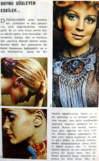 Boynu Süsleyen Eskiler Döşemelerden artan kurdeleleri , püskülleri ve deri parçalarını artık değerlendirme zamanı geldi. Bu yıl uzun kolye yerine boyna takılan geniş, kısa boncuklar, mücevherler, kumaş, deri ve kordone'den yapılmış değişik bantlar moda. Bundan böyle deri parçalarını bükerek boynunuza bağlayabilir ve uzun kolyenizi geniş bir fermuarla takabilirsiniz. Bütün iş sizin zevkinize ve el işindeki yeteneğinize kalıyor. İşte kalın kordone'den yapılmış başınızı süsleyen bir topuzluk. Bunun için evvela topuzunuza göre kağıttan bir kalıp çıkarın. Kalıbın üstüne yapacağınız deseni çizin. Sonra kordeneyi bu şekle göre bükün ve dikerek tutturun. Model tamamlandıktan sonra alttaki kağıdı çıkarın (no.1) Kumaş üstüne boncuk ve sim işlenerek yapılmış bir boyun bandı (no.2) Renkli ipliklerle beyaz işlenerek yapılmış bir broş kolye (no.3) 1970. |