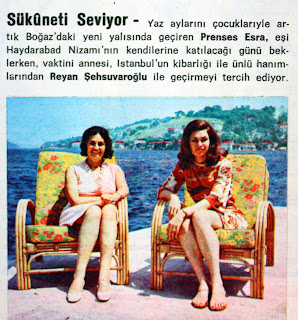 Sükuneti Seviyor : Yaz aylarını çocuklarıyla artık Boğazdaki yeni yalısında geçiren Prenses Esra eşi Haydarabad nizamının kendilerine katılacağı günü beklerken vaktini annesi İstanbul'un kibarlığı ile ünlü hanımlarından Reyan Şehsuvaroğlu ile geçirmeyi tercih ediyor...1970 |