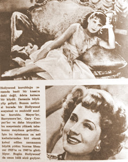 Hollywood kurulduğu zaman basit bir kasaba dahi değil adeta kabaca bir köydü. Zamanla büyüyerek gelişti. Bunun sonucunda burada bir Hollywood sosyetesi ve muhtelif sınıflar kuruldu. Mayer'ler, Barrymore'lar, Gary Cooper'lar ve daha birçokları bu sosyetenin yüksek tabakasını meydana getirdiler. İşte bu tabakanın en asil kadınlarından biri olarak kabul edilen zamanının büyük yıldızı Norma Shearer 1925'de ve 1945'de görülüyor. Bugün Hollywood'da hala onun sözü geçmektedir. Altta Norma Shearer'in sinema yıllarının ilk dönemine ait bir fotoğrafı görülmektedir. |