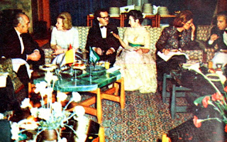 Bayraklar Arasında : Çiçeklerle ve bayraklarla bezenen şeref salonunda yan yana oturan Millet meclisi başkanı Sabit Osman Avcı, Valiha Bayülken, Suudi Arabistan büyükelçisi El Şahabi, Perihan Arıburun, Bayan Şahabi ve Cento genel sekreteri Nasir Assar gece boyunca şakalaştılar...1973 |